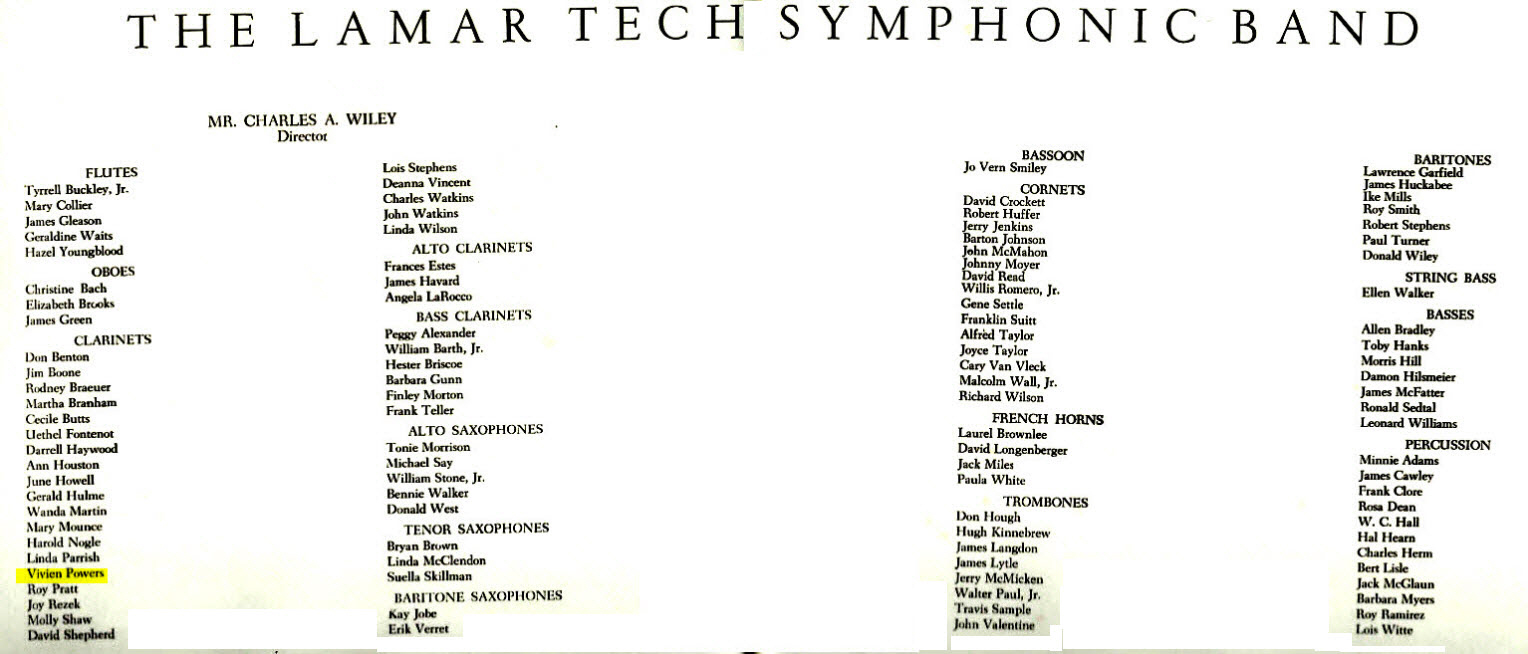 One of Vivien's scholarships was to play in the Lamar Tech marching band. Vivien is listed as playing the clarinet, but due to the large size of the band,
