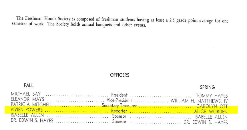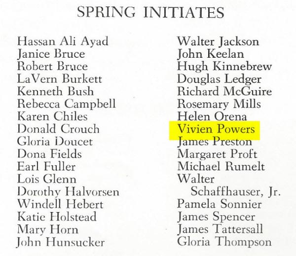 In the spring of 1960, Vivien was initiated into the Freshman Honor Society