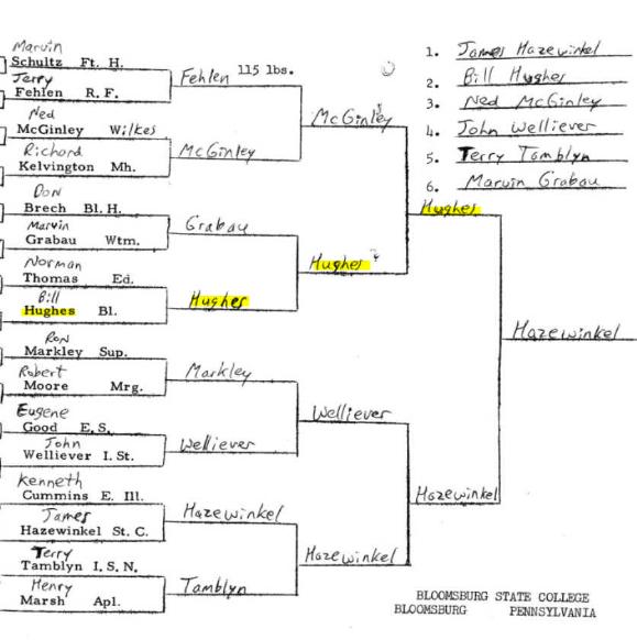 Bill Hughes was married and he and his wife, Carol, may have lived in the Hensel apartments. (Not sure of this) Bill was a regular at our Friday night Poker games and it was during one of these Friday nights, Bill, being the athletic type, decided he wanted to ride in a dryer. Since the laundry facilities were next door to our apartment it was a short trip to the dryer. Bill (after a few brews) decided he wanted me to give him a ride, so I accommodated him. Bill's size of about 5' 6" made him a perfect fit for the dryer. He climbed in and I closed the door and deposited (I think a quarter) and the dryer began spinning. I didn't count the number of times he went around but it was several (keep in mind, I had a few brews also) I am not sure if the door popped open by accident or if Bill kicked it open, or perhaps I opened it. Anyway, Bill came tumbling out, and walked dizzily away. Of course both; the brews and or the spinning contributed to this. Bill said he had a fun ride and wanted to do it again, but I declined to be a party to a 2nd ride. One of our fun activities was intramural sports, including: Football, Basketball, Tennis, Golf and Wrestling. Since Bill had been a college wrestler, he was ineligible as a participate, but he could coach. At one time I remembered where he attended college, but I have long since forgotten. He told me about his bouts and how he had starved himself and even thrown up before weigh-in in order to get into the proper weight class. According to Bill, he finished 3rd, three straight years in the NAIA championships. He finished 3rd because he each year he was defeated by the same guy and this placed him in the position to win 3rd, which he did three years in a row. The guy beating him won the NAIA championship 3 years in a row and Bill place 3rd three years in a row. This was NOT wrasling (like the fake on TV) but true Wrestling. Very few of us had ever known anything about collegiate wrestling, but we were willing to learn and Bill was willing to teach us. The only rules I remember are as follows: At the beginning, one participant is on the floor while the other stands.( I told you, I don't remember the rules) At the time I weighed 138 and was training to be one of the participants when the time came. The time came and someone else was selected to be the one in my weight class and I was glad. Roger was selected to be in the Heavyweight class and after taking a look at the Gorilla he was going to have to face, it was not a hard choice to forfeit. I cannot remember how many bouts we had or if we won any, but I do remember we had fun trying and thanks to Bill, we all knew a little more about Wrestling. Bill received his Masters in 1967 and stayed at A&M where he earned a degree in Oceanography. I learned this by looking on Aggie re-connect, but I have been unable to re-connect personally with Bill. I have tried numerous times to find him. Where ever you are Bill, I hope you are well and just letting you know, I enjoyed knowing you and Carol Note: 11/30/20 Roger Banwart and I have been talking via text about Bill and Wrestling. From Roger I have learned Bill wrestled for Bloomsberg College and Roger found that in 1963, Bill's record was 6-1-1. I also found the bracket for that year fro the national championships, but could find no other information. Will continue to look. Bill is listed in 115 lb category and this is the link to the 1963 brackets.